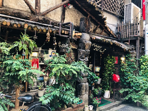 年季の入った木製のテーブルと椅子が置かれた店内は、中二階と半地下に分かれた入り組んだ造りになっていて、まるで秘密基地に訪れたかのようです。様々な国の人形や民芸品が所狭しと飾られていて、眺めているとあっという間に時間が過ぎていきます。また壁のレンガには、お客さんの落書きやメッセージがびっしり。男女で名前を書けば結ばれるという逸話もあるそうです。