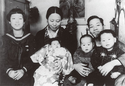 父に抱かれる 1 歳の須藤。後列左から、姉の長女・貞子、母・當枝、父・晃弘、前列左から、妹の三女・容古、須藤、姉の次女・晃古