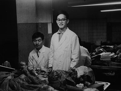 日本大学医学部 2 年生時の同級生と須藤(右)。医師として必須の研修で、人体解剖に臨んでいたときの様子