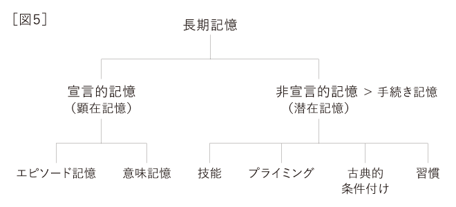 動き、運動行動と記憶との関係はどうなっているのか。心理学での記憶の分類は図5のようになっている。宣言的記憶とは、言語で表現される記憶である。非宣言的記憶とは、言語では表現できない、または表現しづらい記憶である。この中で動きに関する項目としては、「手続き記憶」、「スキル(技能)」と「習慣」の部分である。また「手続き記憶」は非宣言的記憶であり、簡単に言うと「方法」「やり方」の記憶ということで、運動に関してだけではなく、認知機能に関しても使われる。スキル(技能)、習慣、運動の記憶などは手続き記憶である。スキル(技能)には、運動技能、知覚技能(感覚に対する鋭敏化)、認知技能(問題解決における処理能力の向上)があり、動きに関係しているのはもちろん運動技能である。運動に関するスキル(運動技能)とは、ある動きを何回も試行錯誤しながら繰り返し行い学習することによって、次第に顕在的な記憶から潜在的な記憶に移行し、最終的に自動化といって、意識しなくてもその動きができるようになるという過程を経てつくられる手続き記憶のことである。