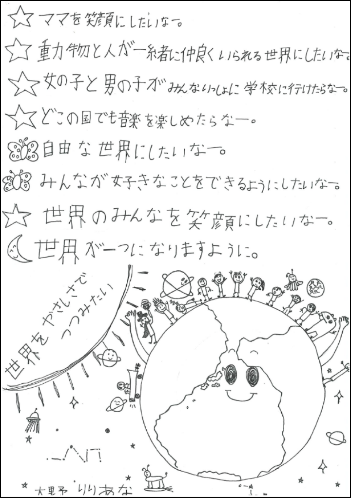 私は自分だけでなく、世界中の人が自由で幸せになれるように、世界の人たちといっしょに自由で幸せな世界をつくっていきたいです。