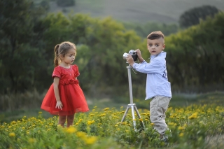 二人の子どもがいる。片方は赤い服を着た女の子で、もう片方は白い服の男の子。男の子はこちらを向いている。